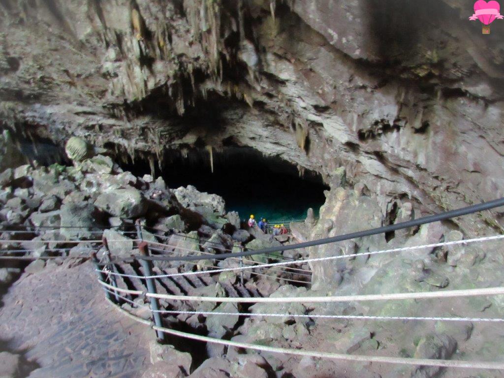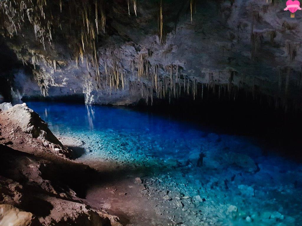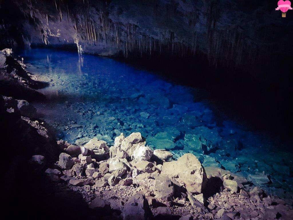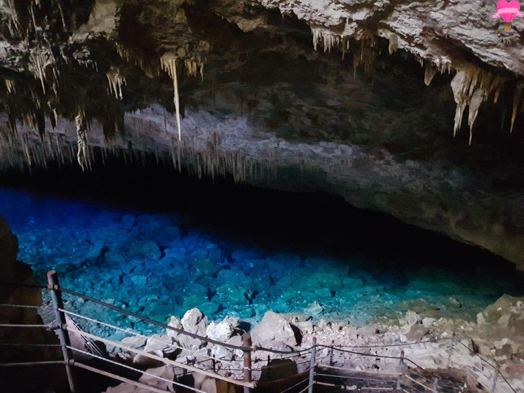 O raio do sol que entra dentro da caverna faz com que a água do lago pareça ser azul turquesa, com 110 metros de extensão e 90 metros de profundidade, as águas são ricas em calcário e magnésio, que age como filtro natural, os sedimentos que entram no lago são decantados para o fundo, por isso a água estará sempre cristalina e transparente.
