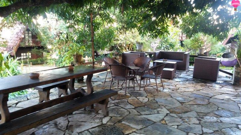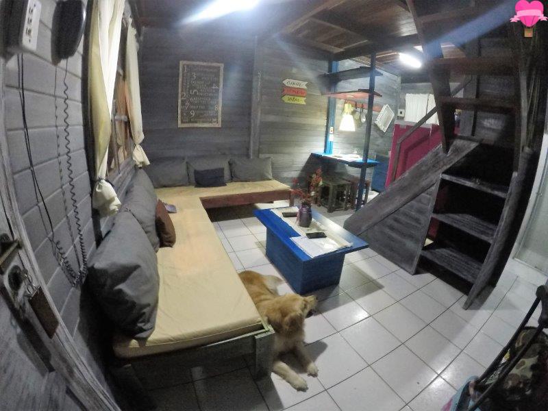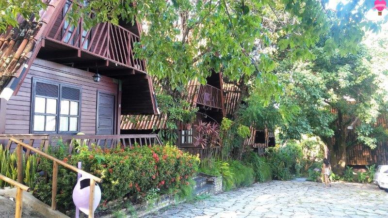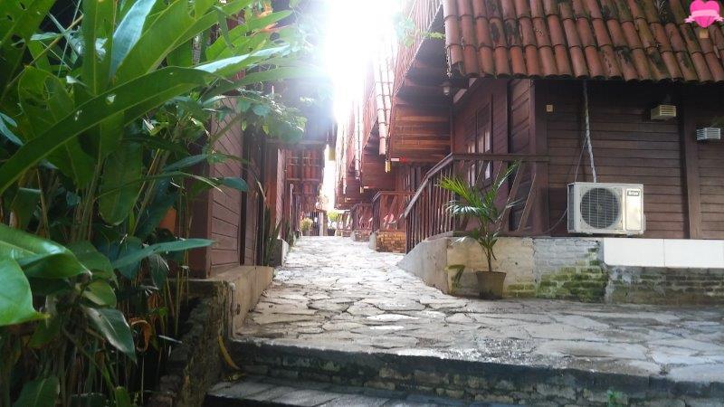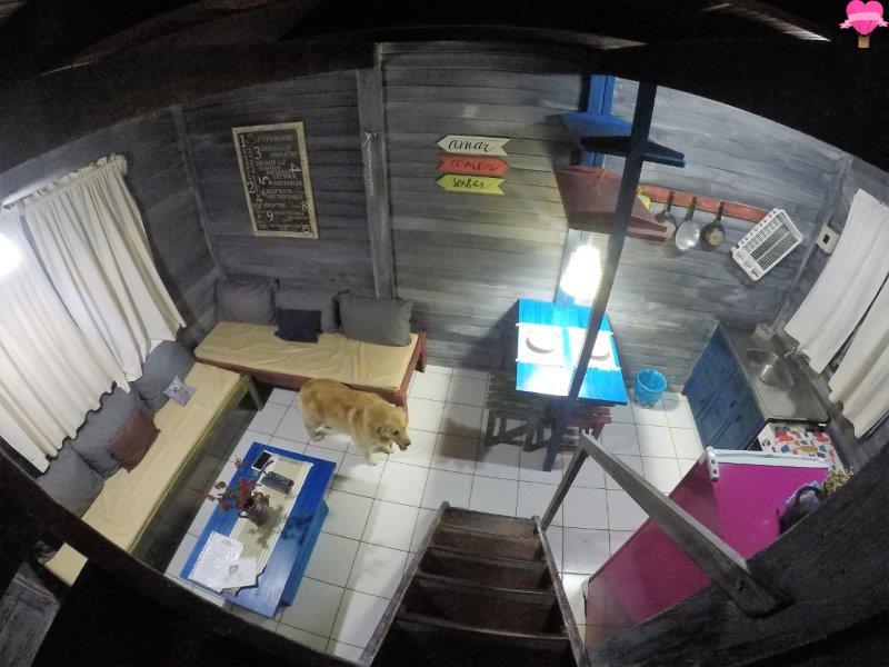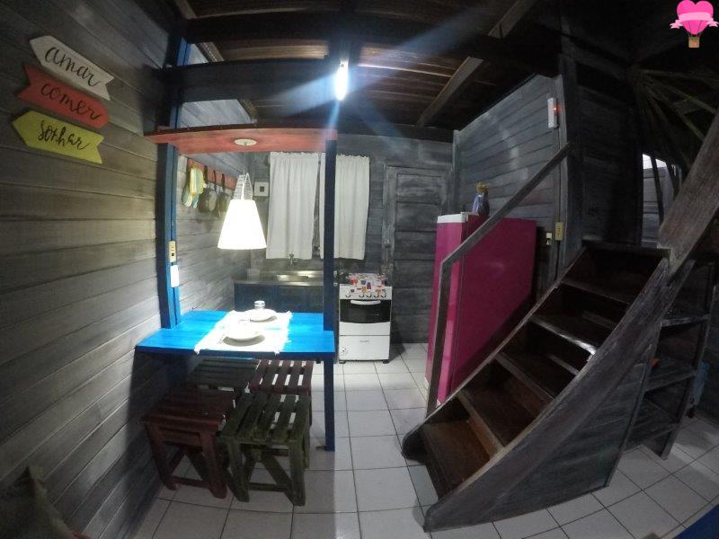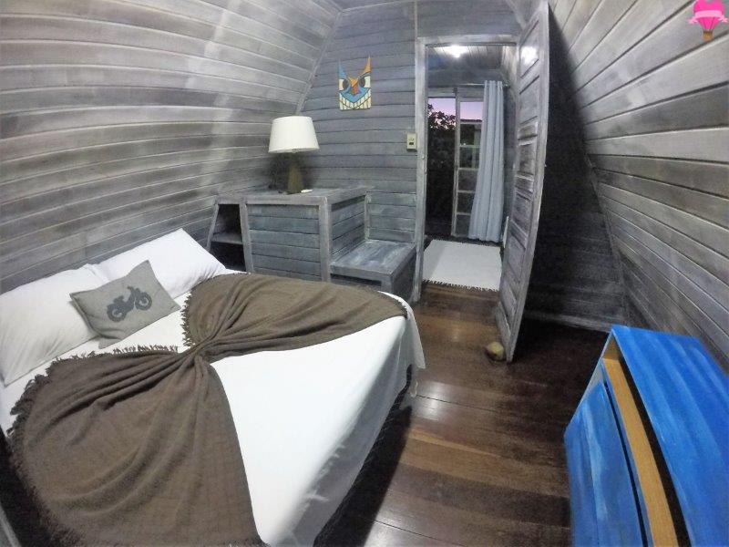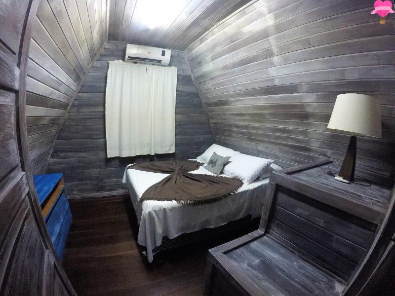 Ficamos no chalé Bem Te Vi, com dois pavimentos bem espaçosos, sendo o andar de baixo com cozinha, sala e banheiro, no andar superior quarto com varanda, bem equipado com cama de casal, cama de solteiro, ar condicionado, ventilador de teto, cofre de segurança, dois sofás cama, fogão, geladeira, utensílios, TV a cabo, internet e telefone. A decoração é rústica, bem organizado, bonito e estava tudo bem limpinho.