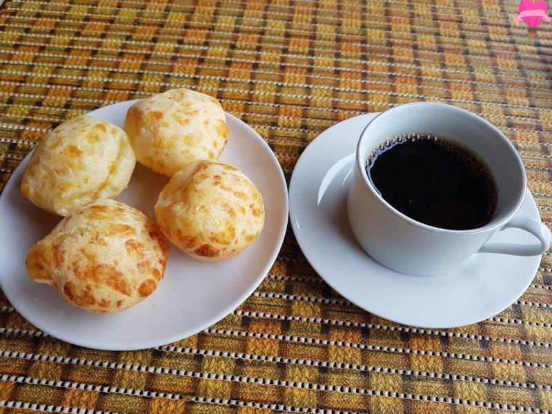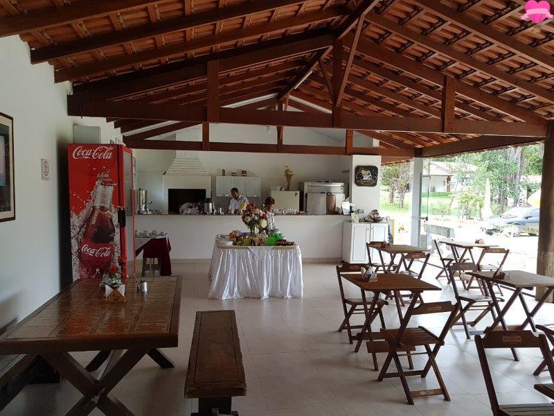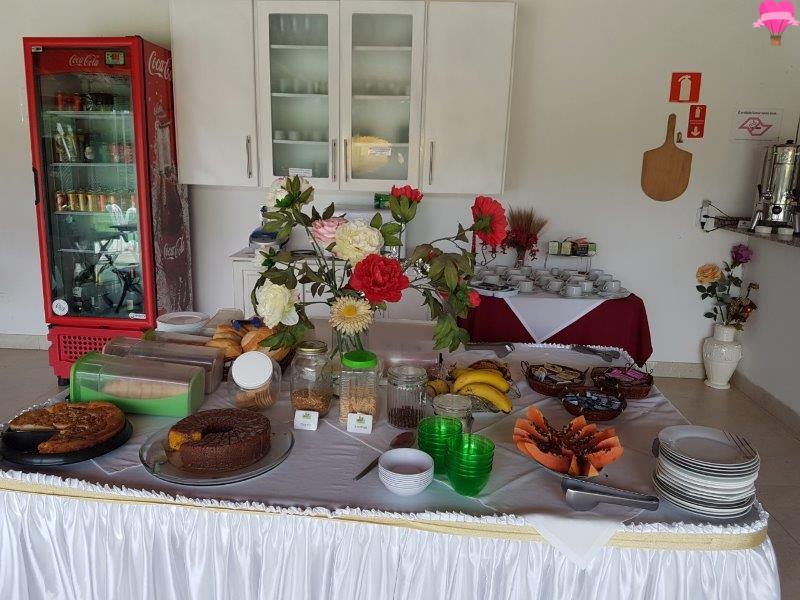 O café da manhã é servido no salão em frente a piscina das 08h às 10h. Café variado com frutas, pães, bolos, biscoitos, sucos e outras variedades, um pão de queijo delicioso, receita tradicional da família.