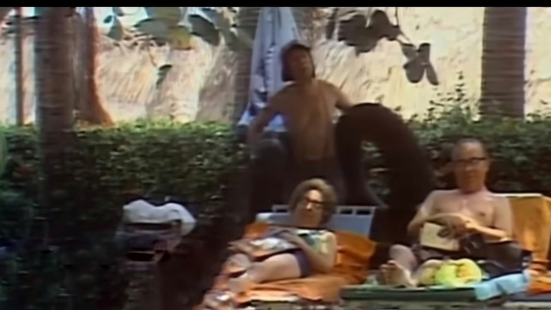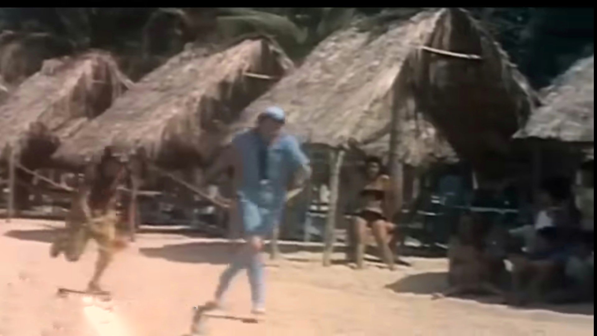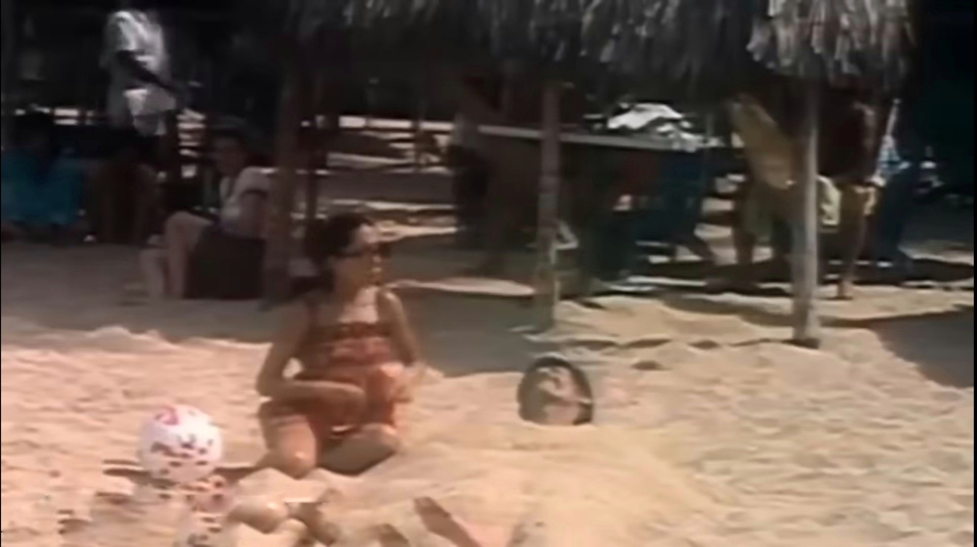Enquanto o Chaves corre atrás do Kiko para bater nele, podemos ver os quiosques com teto de palha e as cadeiras de praia com várias pessoas sentadas ao redor.