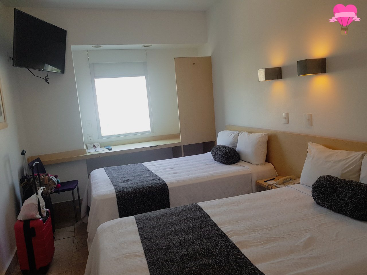 O quarto possui 19 m² com vista para a cidade, dispõe de ar-condicionado, TV à cabo, criado mudo, telefone, mesa de trabalho, espelho grande, várias tomadas para carregarmos nossos aparelhos eletrônicos, enxovais e travesseiros limpos e confortáveis. O quarto é bem simples, mas pelo preço, localização e o que oferece, valeu a pena.