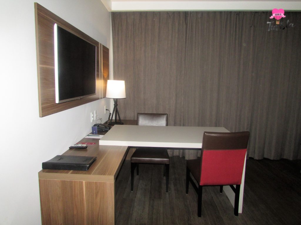 Fiquei no quarto de categoria superior da marca Prodigy, por sinal muito limpo, espaçoso, com aconchegante King Size, armário com cabides, TV, frigobar, ar-condicionado, isolamento acústico, cofre e WI-FI. Banheiro grande, com secador de cabelos, espelho de aumento e ducha maravilhosa. E a janela oferece uma vista maravilhosa.