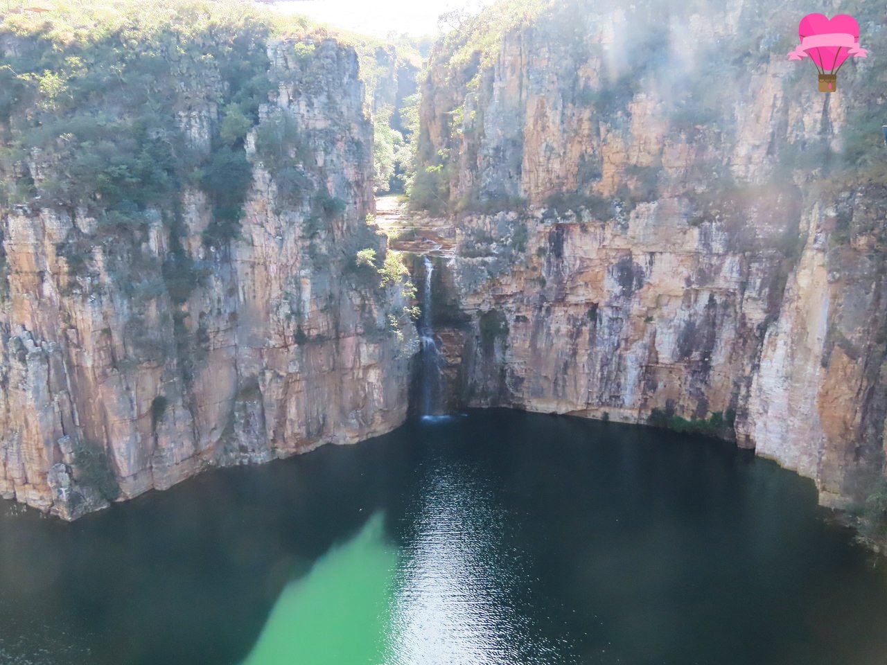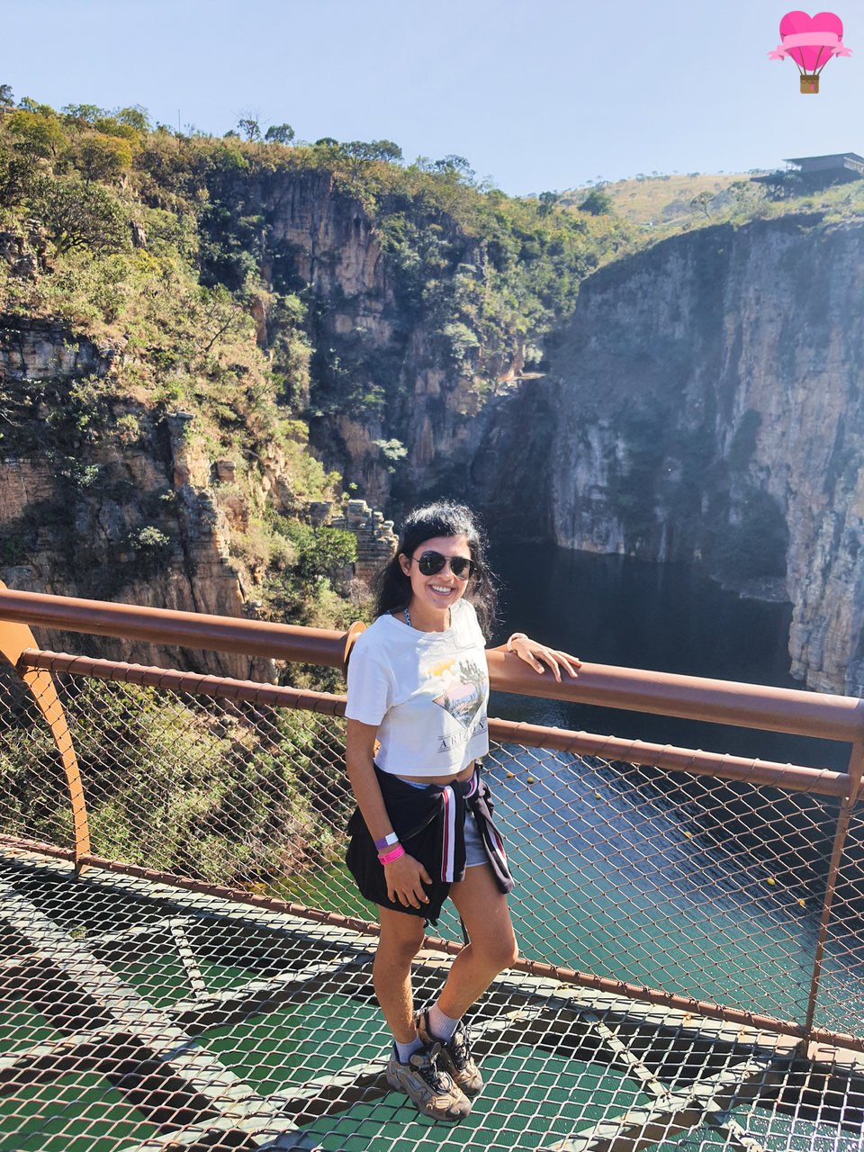 No fim da trilha chegamos no Mirante Escondido que é um deck suspenso com o chão vazado, moderno e construído sobre as pedras. Fica bem em frente aos cânions e uma bela cachoeira, um dos melhores pontos para admirar os enormes paredões e o lago.