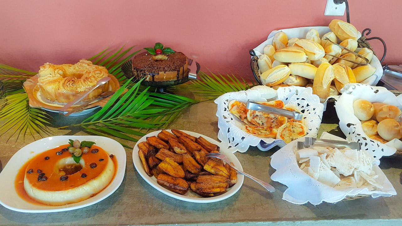 O café da manhã é servido das 7h às 10h, gastronomia baiana muito saborosa e caprichada, com pães, bolos, tortas, frutas frescas, frios, doces, sucos, iogurtes e muitas outras variedades, estava delicioso!
