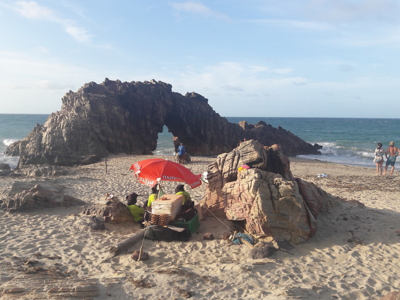 A terceira parada foi na Pedra Furada, o bugueiro precisa parar a alguns quilômetros da famosa pedra, pois não é permitido o acesso de carros, então o único jeito é seguir andando em uma caminhada de mais ou menos 25 minutos, totalmente pela praia. A pedra não é tão bonita, mas vale ir até pela beleza do caminho, entre as rochas e o mar.