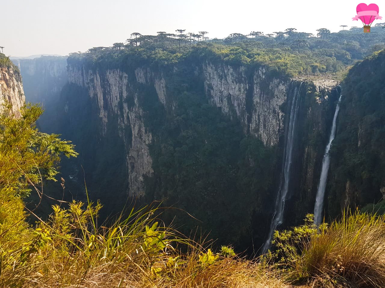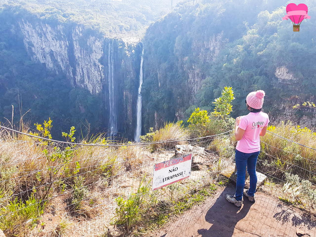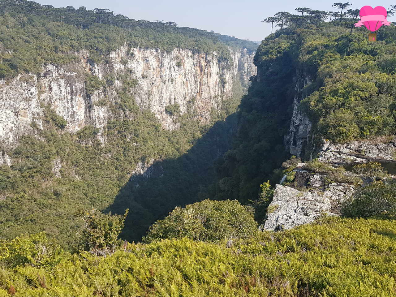 Começamos fazendo a Trilha do Vértice, o percurso é de fácil acesso e são apenas 1,4km de caminhada. No primeiro mirante temos a vista para a Cascata das Andorinhas, formada pelas águas do Arroio Perdizes, possui uma queda de 300m.