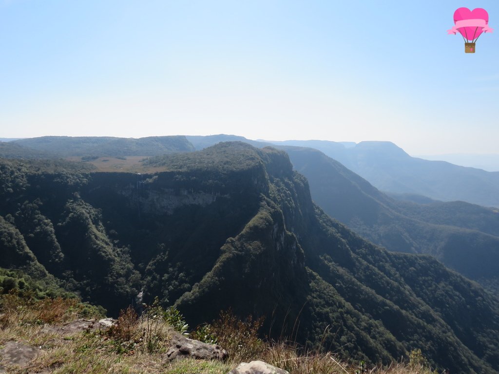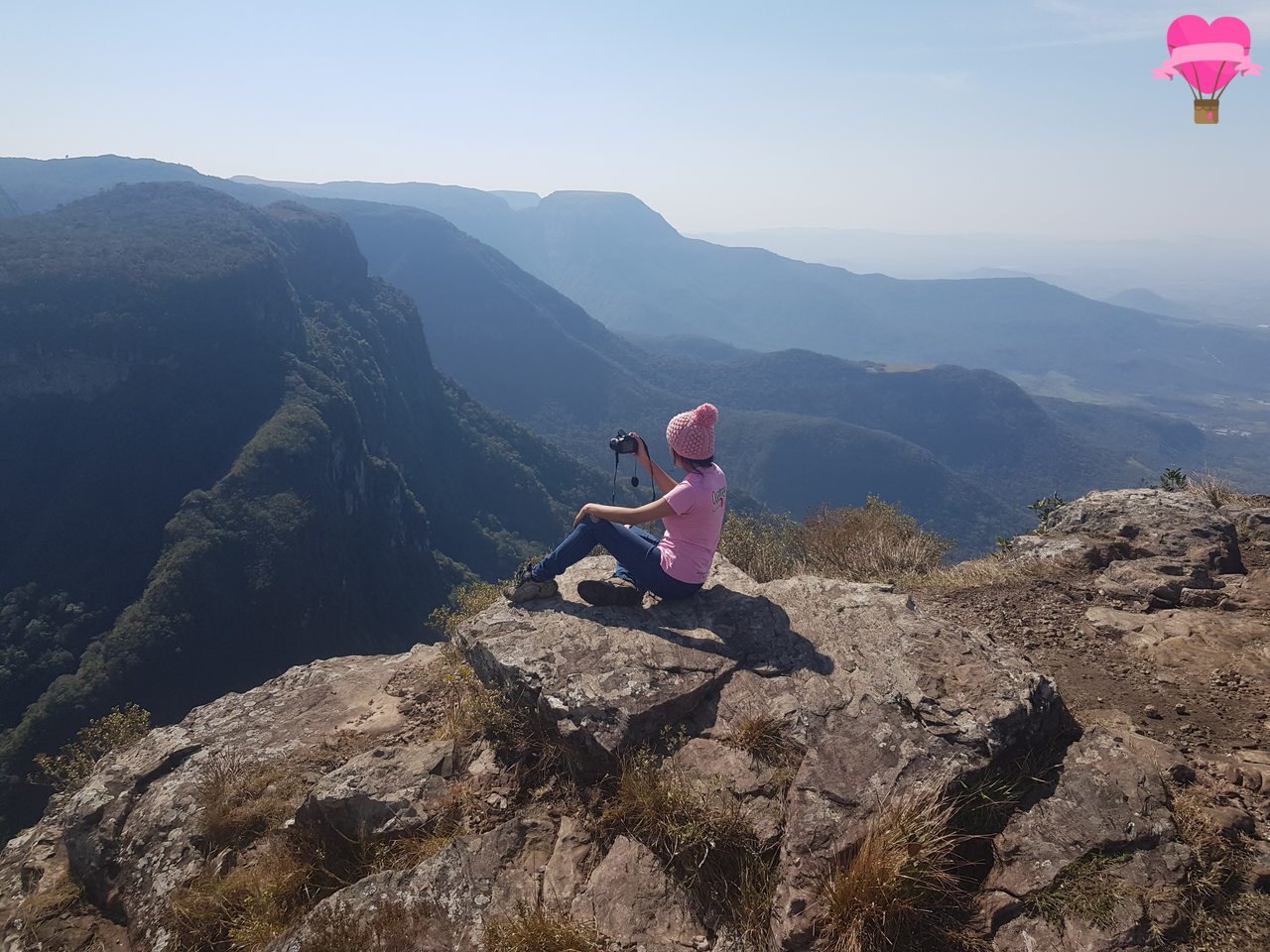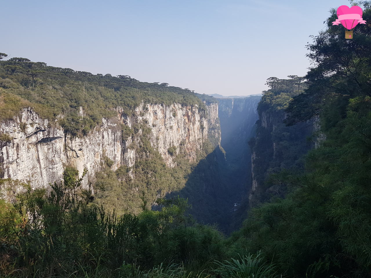 Começamos fazendo a Trilha do Vértice, o percurso é de fácil acesso e são apenas 1,4km de caminhada. No primeiro mirante temos a vista para a Cascata das Andorinhas, formada pelas águas do Arroio Perdizes, possui uma queda de 300m.