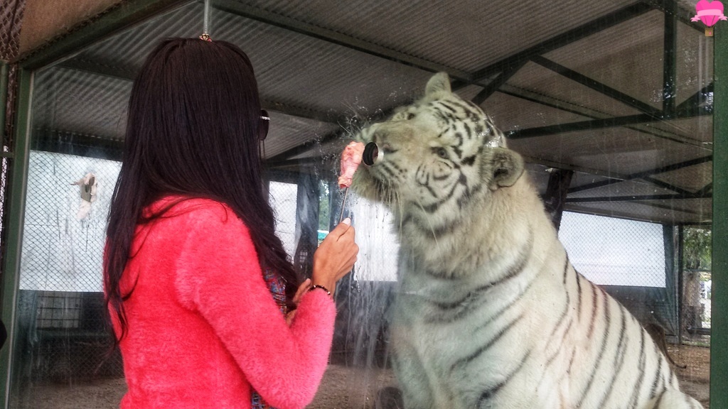 Aos chegarmos fomos primeiro na jaula dos Tigres, a cada 10 minutos entram de 4 em 4 pessoas, podemos tirar fotos com eles e ainda dar leite na boca, ui que medo!